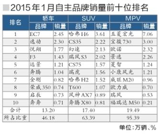 根据数据显示,2014年1月,中国品牌乘用车销量仅占整个市场份额的38.4%,今年首月便迎来开门红,单月市场占有率提升至42.6%,同比增长21.45%。造成中国品牌乘用车市场占有率上涨的主力军为市场热销的SUV车型。据悉,SUV车型与上年同期相比翻了一倍,增长幅度高达111.6%,在整个SUV市场中占有率提高了16.1%。相比之下,中国品牌乘用车的轿车板块依旧比较平稳,销量同比增长仅有0.7%,而市场份额却下滑了0.4%。