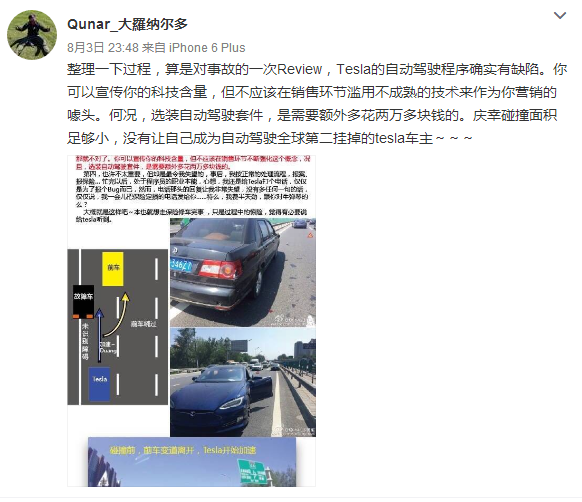 继5月美国特斯拉车主在开启自动驾驶模式撞车身亡后,名为Qunar_大羅纳尔多的微博用户自曝,自己所驾驶的全新特斯拉Model S轿车在自动驾驶模式下无视路边停靠的一辆故障车加速超车,最终导致车左前方剐蹭。整个事故过程与美国特斯拉车主遭遇如出一辙。