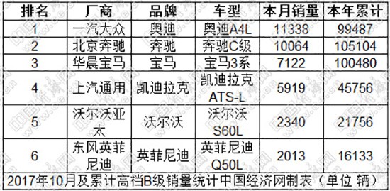 其中,奥迪追赶的步伐仍在继续,A4L已连续三个月蝉联高档B级车市场冠军,10月份销售11338辆,并稳稳地保持住月销万辆的市场能力,与榜首奔驰C级的累计销量差距约为5500辆,未来两个月仍有反超的希望。