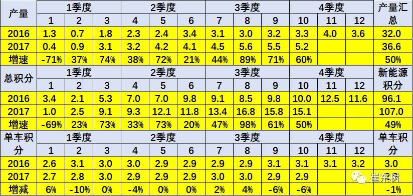 总体看,17年1-10月的新能源汽车积分比例占比达到5.7%,较16年的4.1%有明显的提升。而且由于16年是完整的年度,属于前低后高的特征,例如16年10月是4.5%,而17年10月是7.2%,高出近2.7个百分点,因此17年的实际提升幅度更大。
