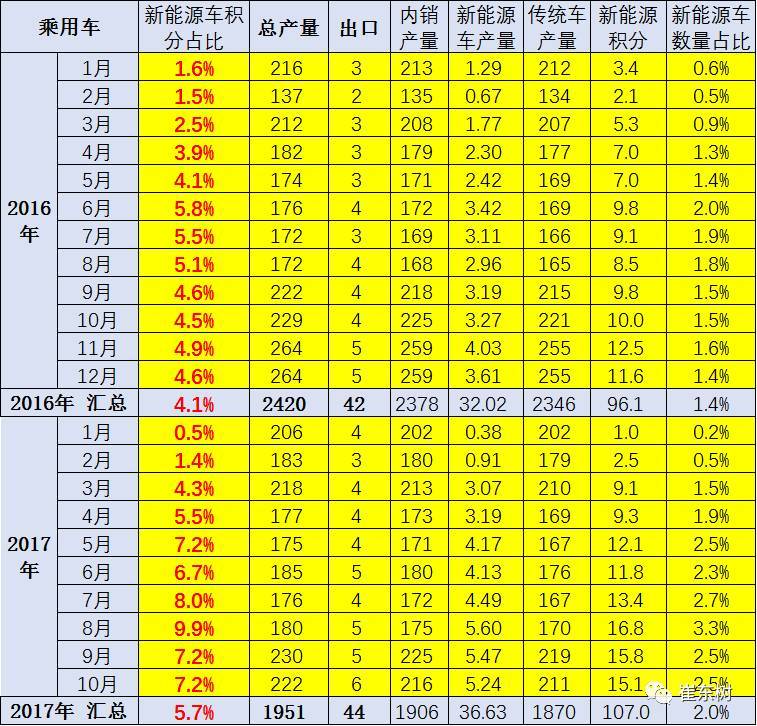 10月的新能源车生产5.2万台,形成新能源积分15.1万分,每台乘用车平均2.9分,较16年10月的3.1分下降6%。。17年1-10月新能源乘用车产量36.6万台,较2016年增长50%