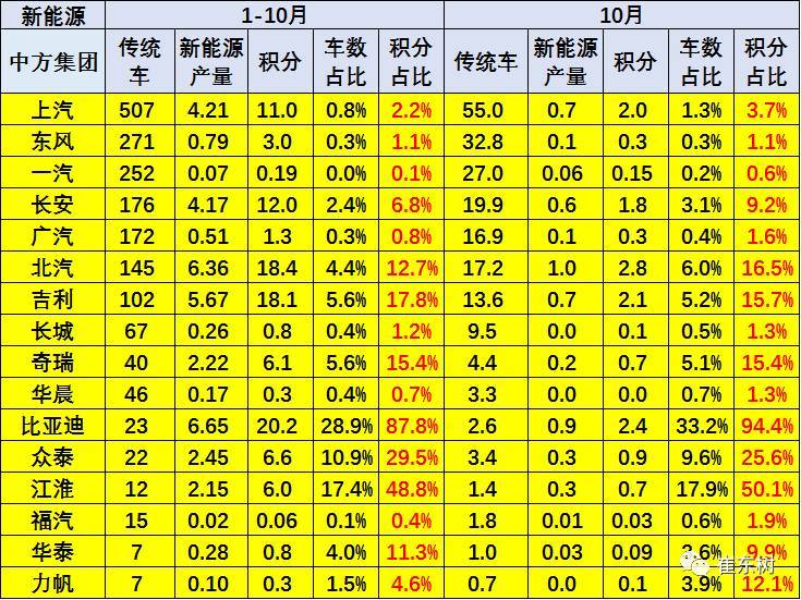 总体看,前三位的上汽、东风、一汽的新能源达标压力最大,严重没有准备充分。尤其是一汽和东风的新能源占比仅有近乎0,新能源汽车积分比例也是几乎为零。这样的状态也导致企业平均油耗与新能源车双积分政策有较大实现难度,政策难以快速推进。但上汽逐步加速跟进,10月的新能源积分达到3.7%。相信随着2020年的各家新能源车产品逐步到位,新能源汽车积分比例应该能有效实现。