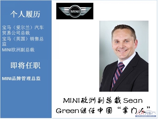 自去年以来,MINI在华“掌门人”一职负责人更换频繁。宝马中国官方透露:Sean Green先生将接替马啸天(Maximilian Kalbfell ),就任MINI品牌管理总监。据悉,担任MINI品牌总监的Sean Green先生,早在1988年便加入宝马集团。在过去的25年中,他先后任职于宝马的售后、营销与销售等部门。在来到中国之前,Sean Green先生曾担任宝马(爱尔兰)汽车贸易公司总裁和宝马(英国)销售总监,过去两年担任MINI欧洲副总裁。此次来华担任MINI在华“掌门人”一职,相信多年的销售经验以及对MINI的了解,将帮助宝马品牌进一步推进MINI品牌在华的销售业绩。