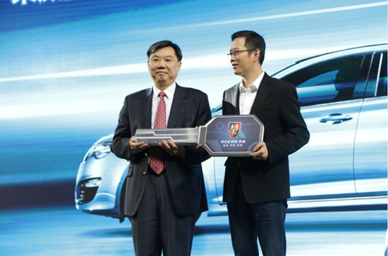 上汽集团董事长陈虹将荣威550PLUG-IN车钥匙交给车主吴晓波