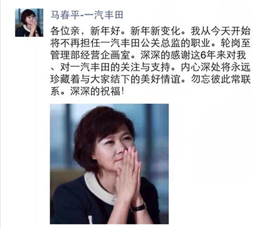 新年传来第一项车企人事变动。2015年1 月4 日,原一汽丰田公关总监马春平通过朋友圈透露自己的职位变动消息,称将“轮岗至管理部经营企划室”。