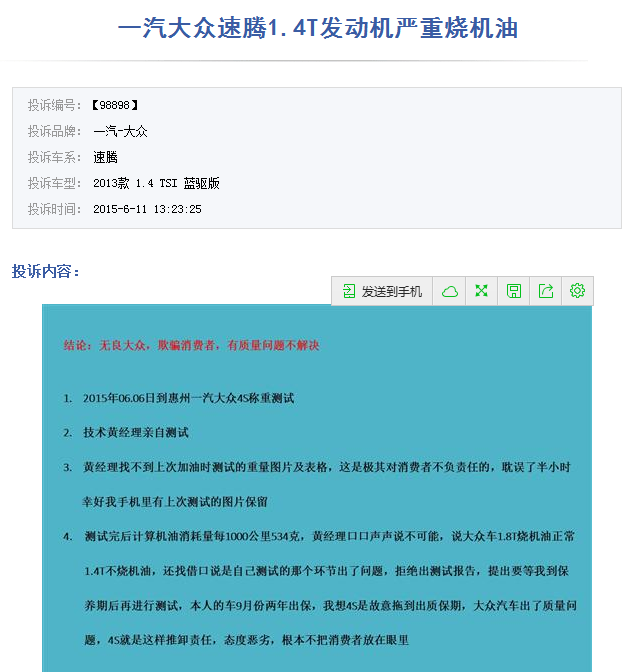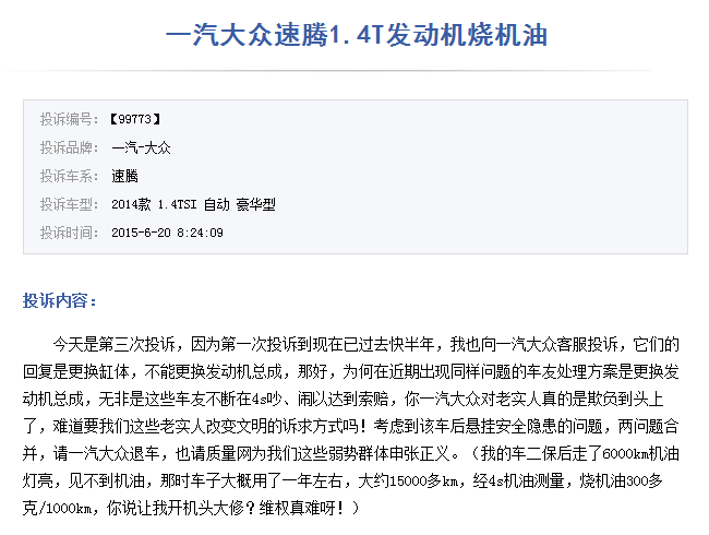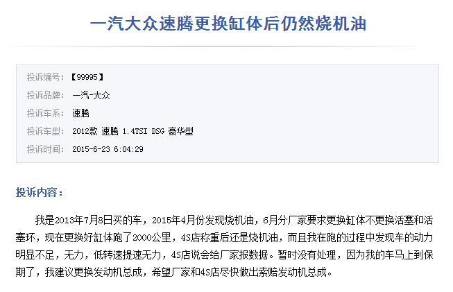 车质网的另外一位网友反应,2012款1.4T的速腾存在烧机油现象,更换好缸体2000公里后,经4S店称重后发现还是烧机油,而且动力明显不足,无力,低转速提速无力。“我的车马上到质保期了,我建议更换发动机总成,希望厂家和4S店尽快做出索赔发动机总成。”
