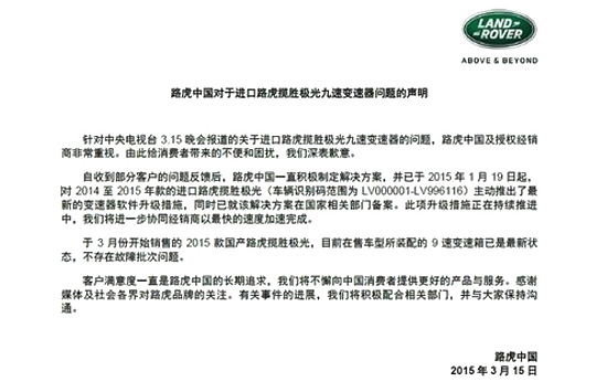 3月15日,进口路虎极光由于变速箱问题被央视曝光,“这打了我们一个措手不及”。尽管央视曝光的车型批次与2015款国产路虎揽胜极光不同,但这仍然影响了已经上市的国产揽胜极光。