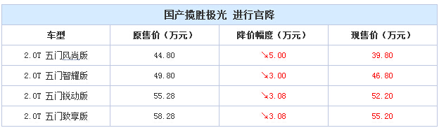 据了解,捷豹路虎下调了旗下国产极光五款车型的 售价,其中2.0T五门风尚版为39.8万元,价格下调5万元;极光2.0T五门智耀版价格为46.8万元,价格下降3万元;极光2.0T五门锐动版为 52.2万元,下调3.08万元;极光2.0T五门致享版售价为55.2万元,价格下调3.08万元。