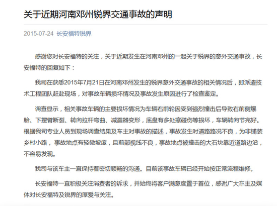 其实事件的起因源于一起交通事故。7月21日,在河南郑州,一锐界车主在行车途中发生事故。这本来没什么,但“奇怪”的是,事发车辆的前轮支架出现断裂。此事一出,“勤快”的网友就将现场图片上传到了微博,一传十十传百,这件事就这样被轰轰烈烈地传播开了。