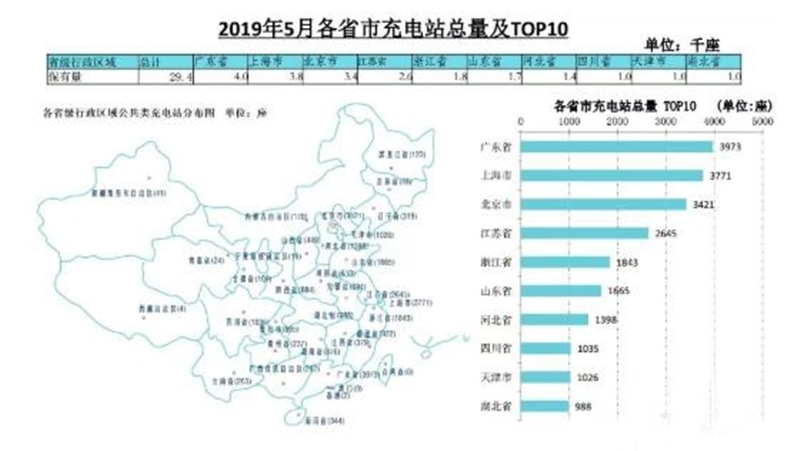 从各省市运行情况来看,公共充电基础设施建设区域较为集中,前十省市北京、上海、广东、江苏、山东、浙江、河北、安徽、天津、湖北,公共充电基础设施占比达75.3%。此外,公共充电基础设施充电电量集中度较高。据悉,2019年5月全国充电总电量约3.59亿kWh,较上月增加0.3千万kWh。