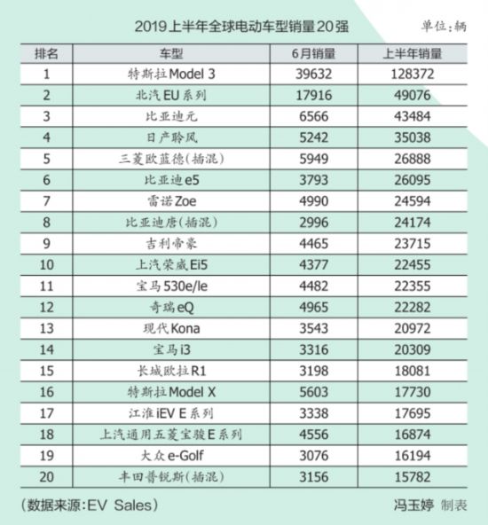 2018年,特斯拉Model 3以15.5万辆的销量成绩成为全球最畅销的电动车型。而在今年上半年,该车的销量就已达到12.8万辆,超过排行榜第2~4名车型销量的总和,占据全球电动汽车市场11%的份额。的确,今年上半年,特斯拉Model 3在欧洲和美国的销量一路猛涨,分别达到3.78万辆和6.77万辆。今年6月,特斯拉以3.96万辆的销量创造有史以来电动车型最高单月销量纪录。排在榜单第二和第三位的均为中国自主品牌旗下车型——北汽EU系列和比亚迪元,这两款车上半年的销量较为接近,分别为4.9万辆和4.3万辆。若单看6月销量,北汽EU系列则遥遥领先,达1.79万辆,同比增幅达到惊人的1113%,而去年排行榜的亚军——北汽EC系列已悄然从榜单上消失。