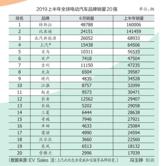 在上半年全球电动汽车品牌销量排行榜中,宝马和日产的表现较为稳定。宝马主要依靠宝马530Le和宝马i3两款车拿下第4的位置;而日产则主要靠聆风这款明星车型成为第6。EV Sales的数据显示,今年上半年,日产电动汽车全球销量为4.75万辆,而聆风贡献了74%。大众在电动车市上的表现也值得肯定,大众e-Golf销量不错。起亚进步明显,从榜单的第19位上升至第11位;吉利从第14位上升至第7位。而长安和长城不仅首次上榜,并且分列第12和13位,名次不错。东风重回榜单前20,排在第19位。有人欢喜有人愁,奇瑞和雷诺的排名下滑不少,而华泰和江铃则掉出榜单前20。(冯玉婷)