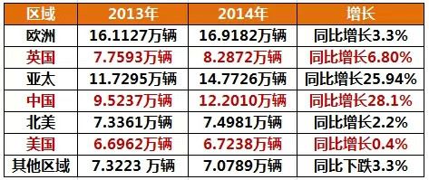 2014年,捷豹路虎的全球销量为46万辆,同比增长8.9%,全部车型都在其英国总部基地的三个工厂生产。其中,捷豹销量8万辆,同比增长6.4%;路虎销量38万辆,同比增长9.4%。按市场构成统计,如附表所示,中国已成为捷豹路虎全球第一、增速最快的市场;其他重点市场也是全线飘红。目前捷豹路虎的英国产能空前吃紧。