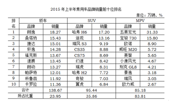 2015年上半年整体车市低迷,中国品牌却逆势上涨,特别是长安汽车(微博)、长城汽车、吉利汽车、比亚迪汽车、奇瑞汽车、江淮汽车、东风柳州、北京汽车、众泰汽车等。其中,长安汽车以45.9%的涨幅,52.2万辆的销量夺得冠军,并且在整个乘用车市场销量排名第四。
