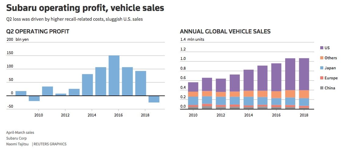 斯巴鲁的股价今年已经下跌了近20%,或将连续三年下跌。召回成本虽是造成亏损的主要原因,同时由于美国市场需求疲弱,斯巴鲁2018财年第二季度全球销售下滑6%。