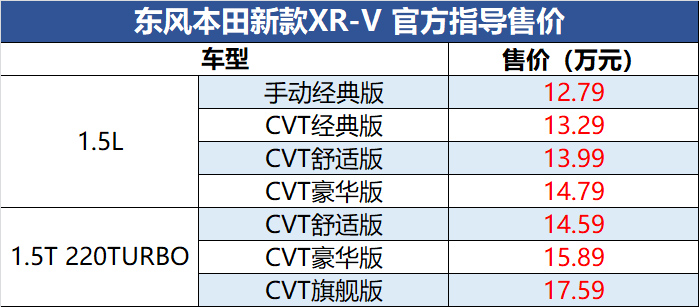 中国网汽车7月11日讯(记者 王芳)东风本田新款XR-V于今晚正式上市,共推出7款车型,售价区间12.79-17.59万元。新车在外观及配置上都做了升级,值得关注的是,其换装了思域同款1.5T(220Turbo)发动机,满足国六排放标准。