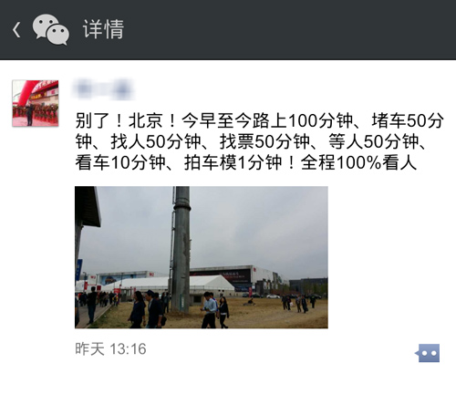 其实今年的北京车展还有一件和媒体相关的事情:之前据路边社消息,今年北京车展严禁杜绝给媒体发“车马费”。随着车展的进行,当不少媒体发现传言渐渐成真之后,遂勃然大怒,约好的活动拂袖而去,还未采访就神秘消失。夜半时分朋友圈成了“吐槽大本营”,除了责怪组织方办事不力,让车展又一次变成了人展之外,“没得到实惠”恐将是某些媒体人如此脑火的真实原因。