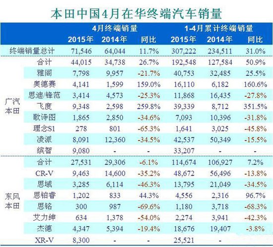 2015年4月份,本田在中国总计销售了71,546辆汽车,较之2014年4月份的64,044辆,同比攀升11.7%。1至4月份,本田在华累计终端销量为307,222辆,去年同期234,511辆,同比大涨31.0%。