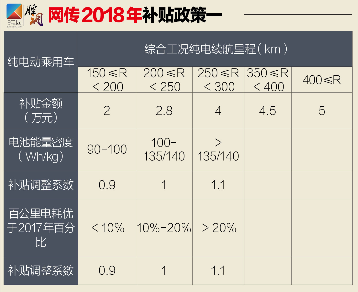 现行办法是纯电动车续航里程不低于100公里,并分为三档,补贴金额分别为2万、3.6万和4.4万元,地方补贴不得高于国家补贴的50%。而在2018年,国家对续航里程的补贴起点由100公里上升到了150公里,并且会进行更为细致的等级划分。按照网上两版不同的方案,补贴金额会在2-5万元或1-5万元不等。