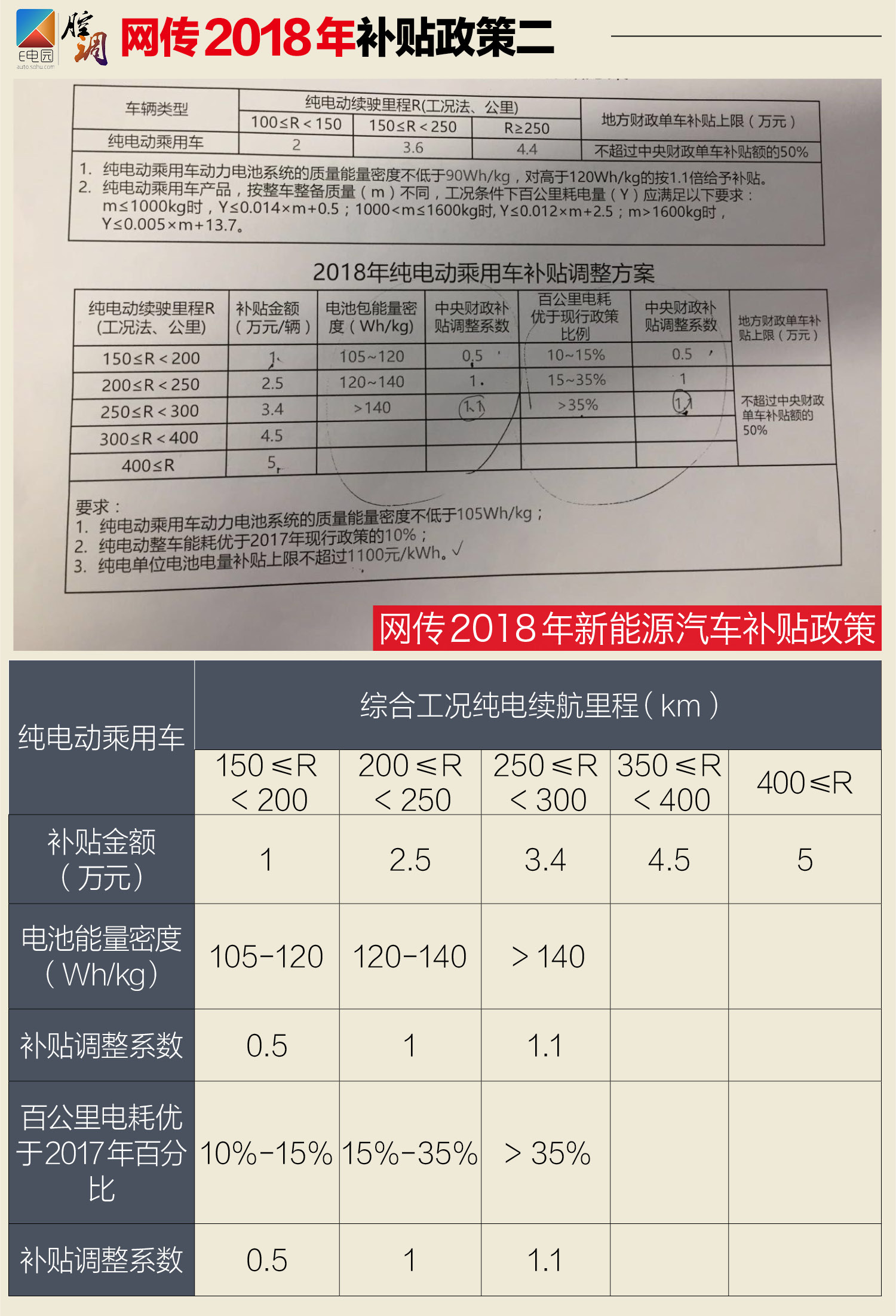 首先,我们先来看看现在网上流传的两版2018年新能源汽车补贴方案,虽然两版内容的补贴金额以及对于电池能量密度、百公里电耗的要求略有不同,但整体标准基本一致,也就是说2018年的新能源补贴,除了按照续航里程来区分补贴金额,还会加入电池能量密度以及百公里电耗作为系数参考,所谓未来的补贴将会依据:补贴金额=续航里程分档×电池能量密度系数×百公里电耗系数。