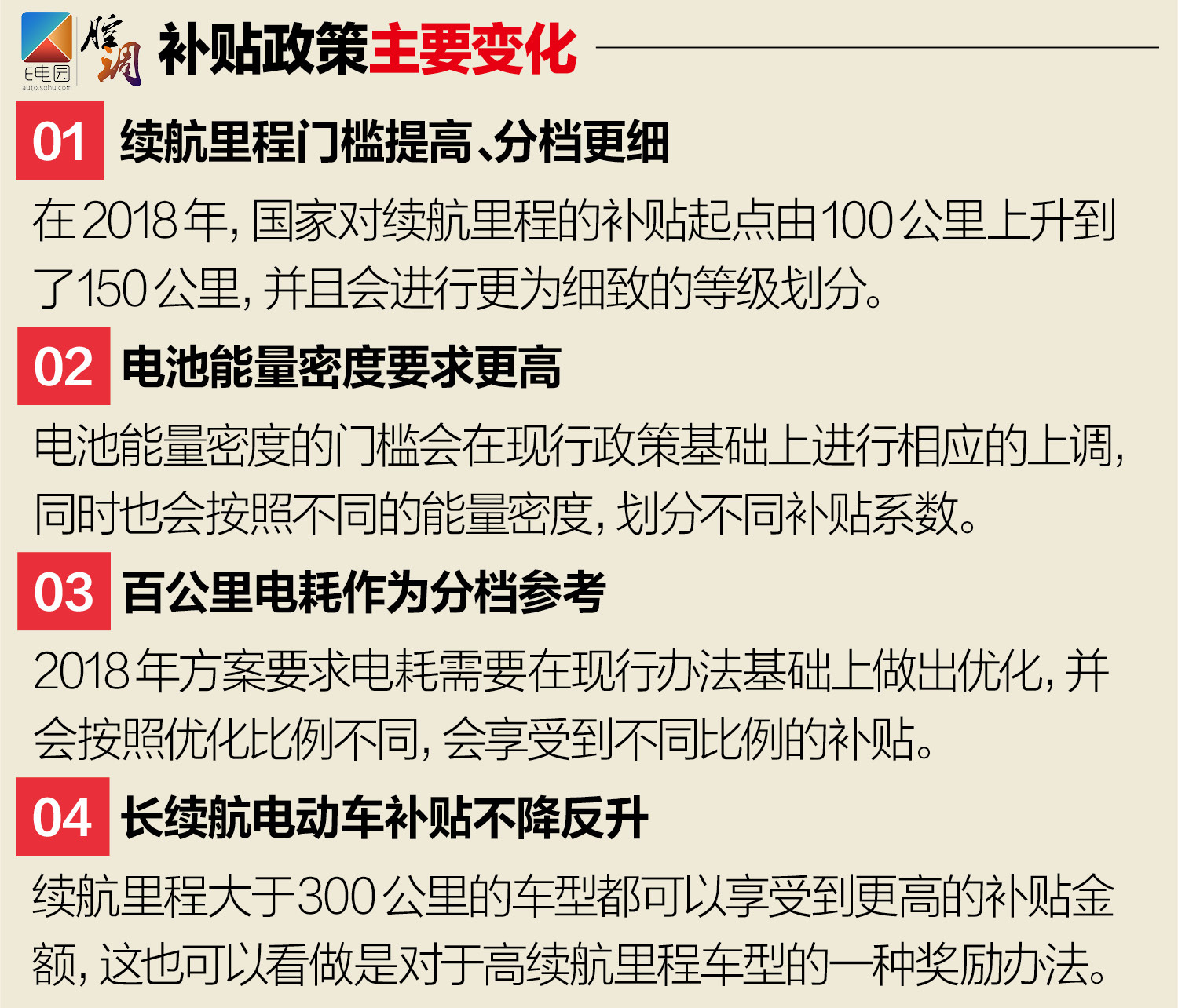 现行的2017年新能源汽车补贴政策对于电动车在续航里程、电池能量密度以及百公里电耗的要求并不算高,也就导致了较低续航里程的电动车和高续航里程车型之间的补贴金额并没有拉开很大差距。而网传的两版2018年新能源汽车补贴对于电动车提出了更高的要求,尤其是第二版方案,使得很大一部分电动车无法拿到全额补贴。但更为严苛的新能源补贴方案对于我国的新能源汽车发展,绝对是利大于弊,这样也能督促车企将所有精力放到对电动车技术方面的研发当中。虽然说作为消费者的角度,可能更希望补贴金额越高越好,但从新能源车发展的角度来看,严苛的补贴政策更有存在的意义。而且当车辆的续航力车、电池能量密度以及百公里电耗都达到较高水平的时候,补贴也就会自然而然的提升,相信这样做无论是对于消费者,还是对于车企,都是有好处的。
