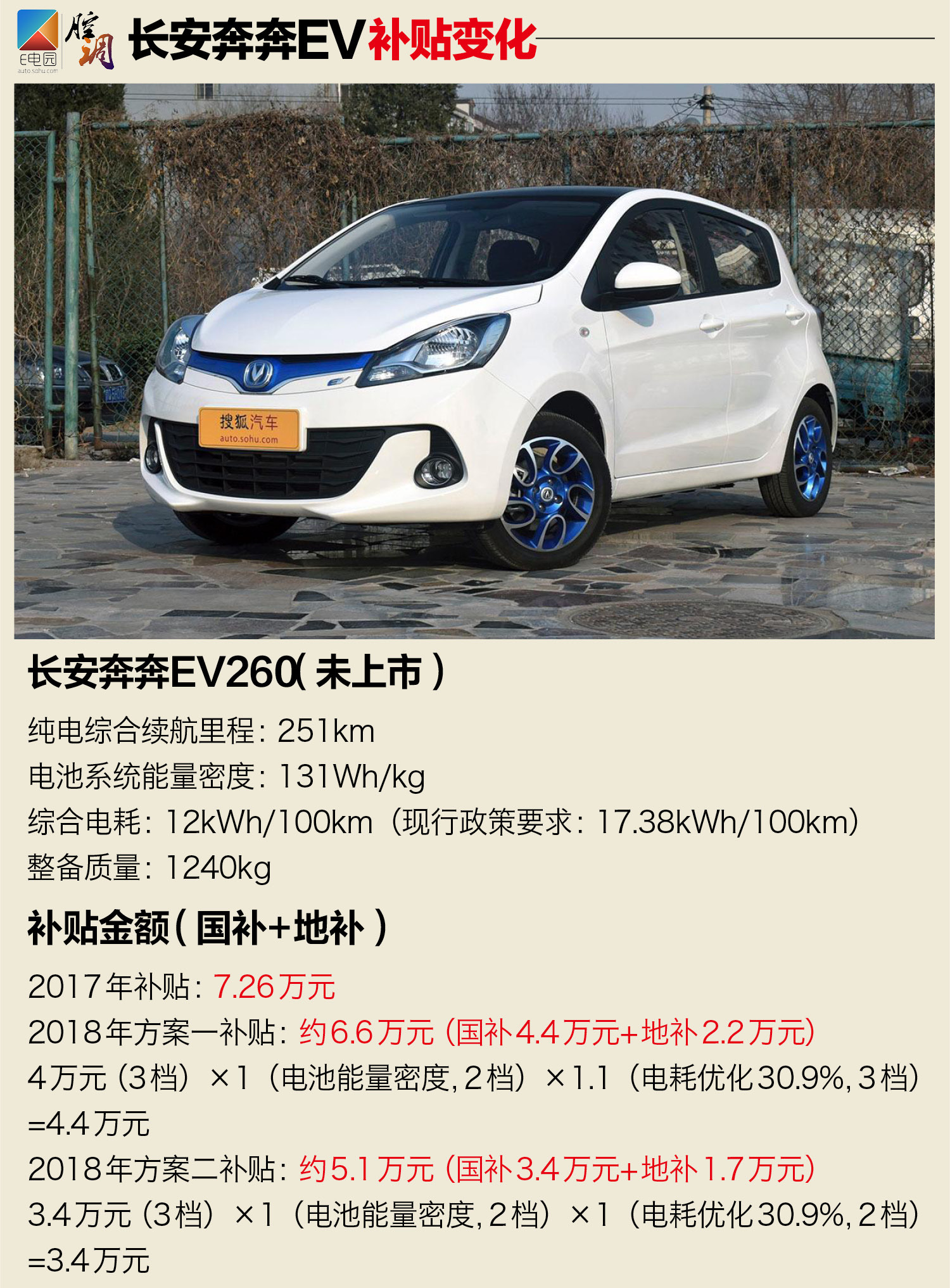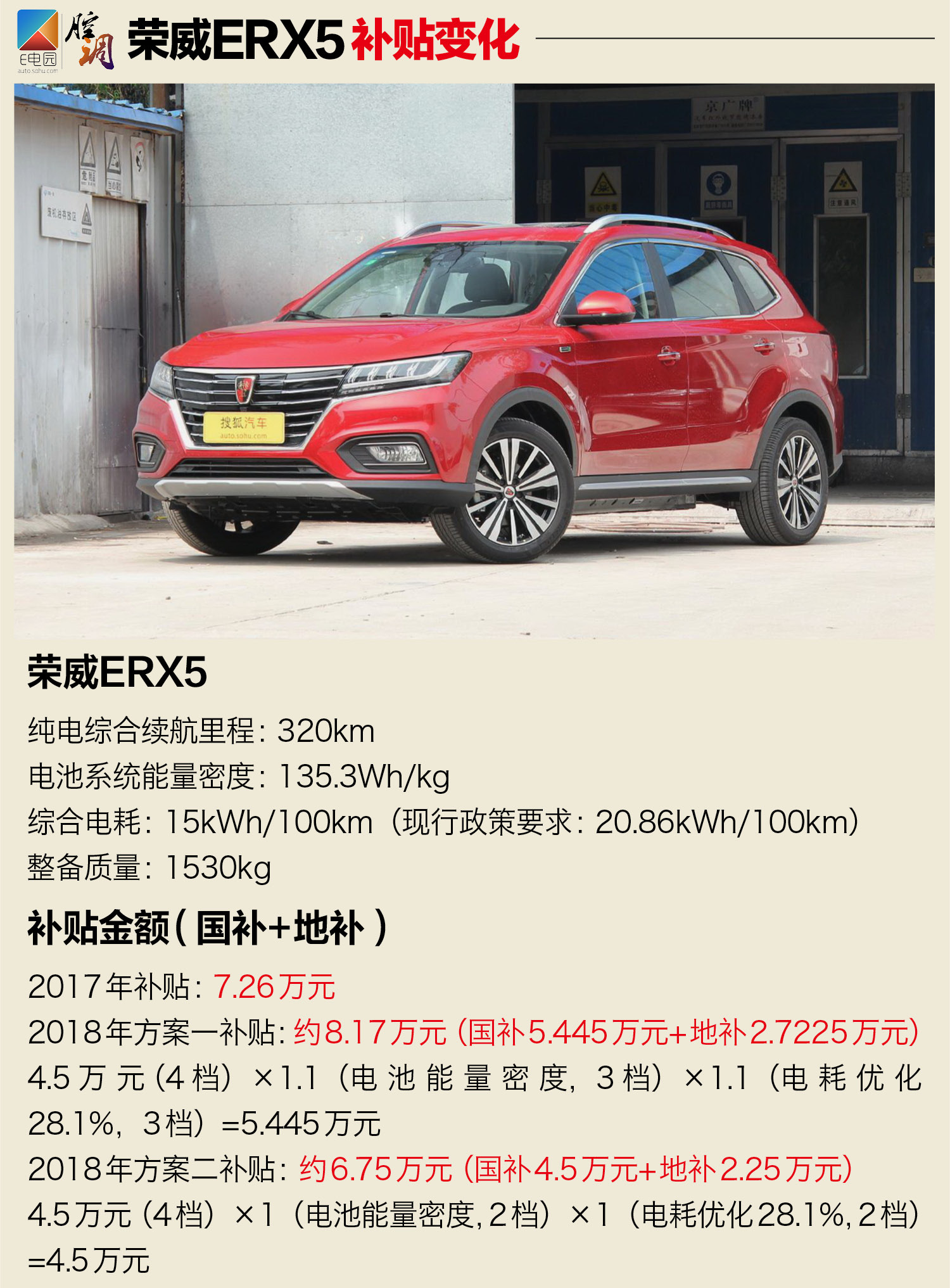 对于上述三款车型来说,按照现行办法,虽然电池能量密度有所差异,但还是都可以享受到1.1倍的补贴,再加上续航里程也达到了最高标准的250公里,所以国补+地补总额可以拿到7.26万元的补贴,这也是现行办法的最高补贴标准。但如果放到2018年的补贴方法中,续航里程更加细化,所以奔奔EV260在基础补贴金额上就要少于其他两款车。另外荣威ERX5的电池能量密度达到了135Wh/kg以上,所以在这一项上可以享受到1.1倍补贴。由此可见,在现行办法中补贴相同的三款车,在明年新政中,由于自身差异,也会导致补贴金额的差异。
