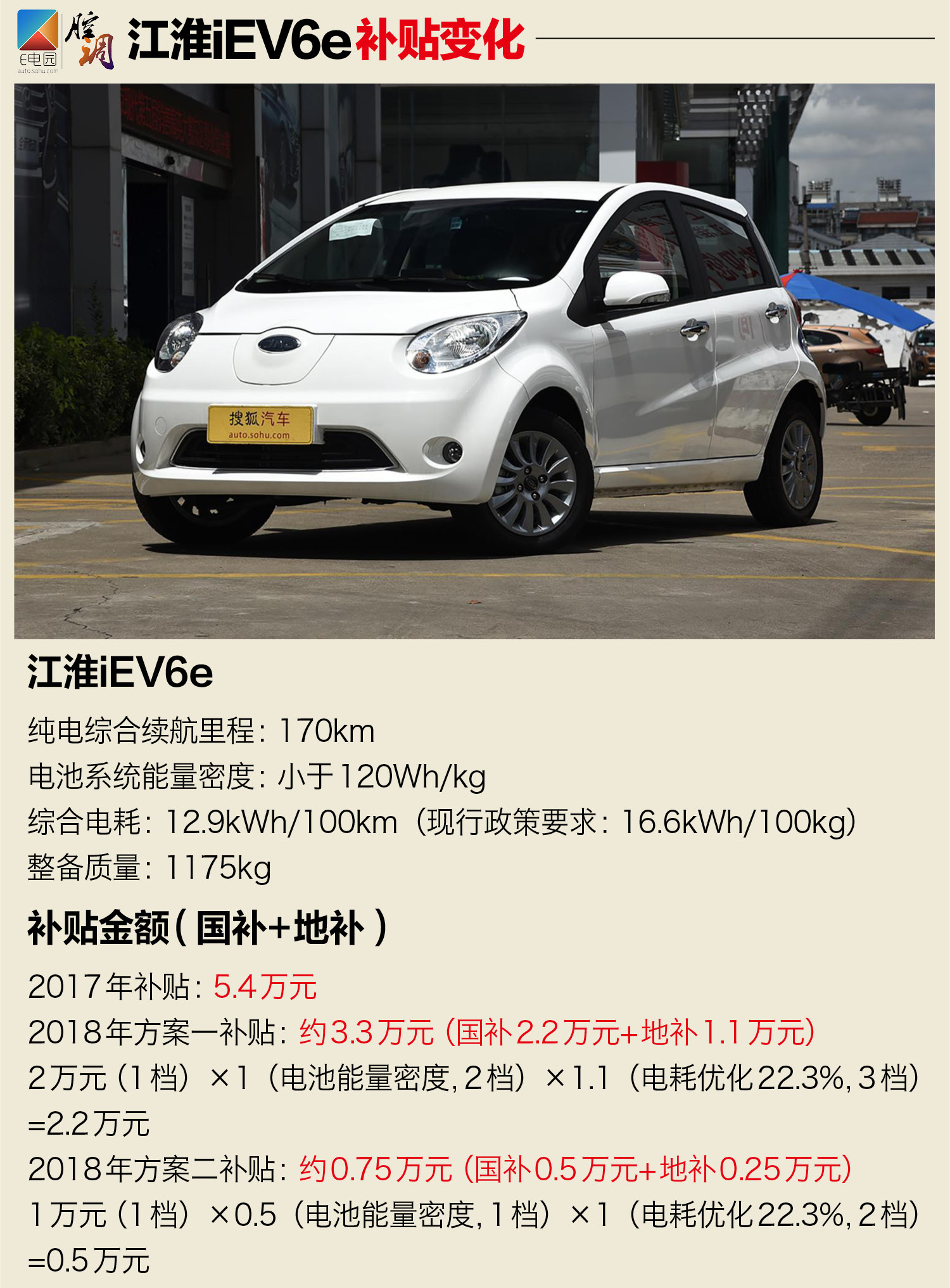 而江淮iEV6e作为微型电动车的代表车型之一,几乎具有微型电动车的一切特征,续航里程不算长(小于200公里),但在现行办法中依旧可以拿到还算不错的补贴。不过在2018年新政中,由于续航里程的门槛提升,同时档位划分更细,所以此类微型电动车的补贴额度也会大受影响。尤其是代入到低续航补贴额度低,对电池能量密度要求更高的方案二中,江淮iEV6e的最终补贴金额居然不足万元,这在很长时间以来都是无法想象的情况,所以随着新政的实行,未来主打占号等目的的微型电动车市场将会受到很大的冲击。
