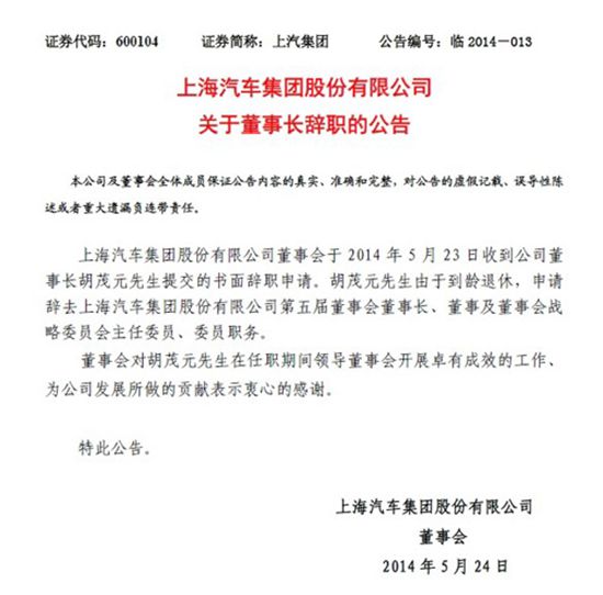 上汽集团董事长胡茂元退休 总裁陈虹接任