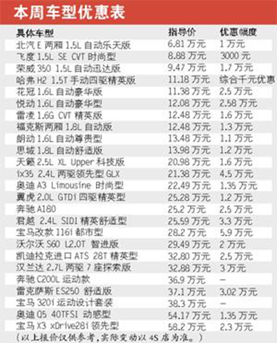 12月份不少豪车销售店还有库存销售任务,如雷克萨斯ES依然保持了超过3万元的让利幅度,IS车型优惠1 万元左右,GX最高优惠2.5 万元;讴歌ZDX 虽然现车不多,但最高也有31万元优惠,销售主力RDX 也有14万元让利;沃尔沃S60L略回缩,但也给出了最高优惠5 万元诱惑,XC60优惠5 万元起;宝马X5最高优惠23万元,5 系则价格稳定;奥迪A3有超过1.3 万元优惠,Q3优惠2.7 万元,Q5优惠超过6 万元;奔驰A 级优惠2 万元,B 级优惠3 万元等。