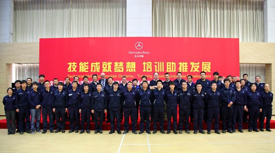 近日,北京奔驰2014年职业技能竞赛颁奖仪式暨卓越高技能人才“清华”培训班启动仪式在北京奔驰厂区内隆重举行。北京奔驰总裁兼首席执行官戴斯先生、北京奔驰党委书记、高级执行副总裁陈宏良先生,以及北汽集团人力资源部副部长孙超女士、北汽集团工会副主席、北汽股份工会主席李承军女士、戴姆勒大中华区人力资源部总监Mr.Martin Spicale共同出席仪式,并为30位在世界级、国家级和市级竞赛中取得优异成绩的北京奔驰员工颁发了奖项。同时,以此为契机,北京奔驰也正式启动了汽车制造企业创新人才能力提升高级研修班项目。该项目将面向北京奔驰各部门近年来在市级以上各级技术比赛中获奖的员工,以及各部门的优秀技师和高级技师及一线的技术骨干人员,旨在促进高技能人才综合素质的持续提升,打造北京奔驰团队和中国汽车工业领域中的佼佼者和领军人物,将北京市委市政府提出的高技能人才培养“百、千、万”工程落到实处。