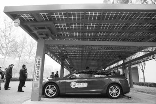 位于华贸公寓的本市首个光伏超级充电站昨天亮相,本月中旬将面向社会公众开放。记者贾同军摄