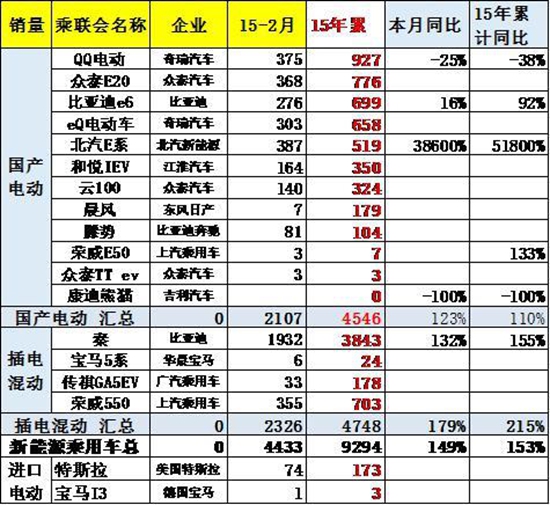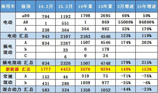 2015年开年伊始,新能源汽车表现出强劲的增长势头,据全国乘用车市场信息联席会秘书长崔东树统计:1-2月,新能源汽车同比“数倍”增长,微型电动车规模最大,A0级纯电动乘用车增速较快,而插电混动的高端也有突破。