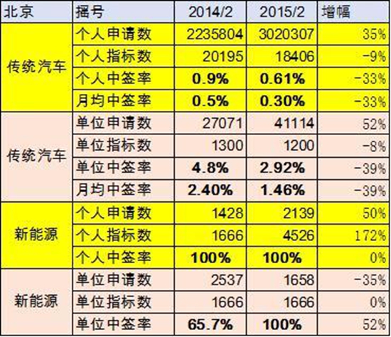 据崔东树介绍,北京的摇号体系很完善,15年2月新能源车摇号指标从14年2月的1666个上升到15年2月的4526个,指标充裕,而申购群体也从1428上升到2139个。