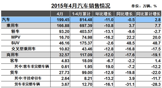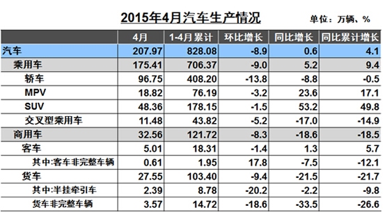 4月,汽车生产207.97万辆,环比下降8.93%,同比增长0.59%,比上年同期回落8.25个百分点;销售199.45万辆,环比下降10.98%,同比下降0.49%。其中轿车增速-2.7%,减少11.07万辆;MPV增速20%,增加12.51万辆;SUV增幅最高,增速48.7%,增加57.46万辆。