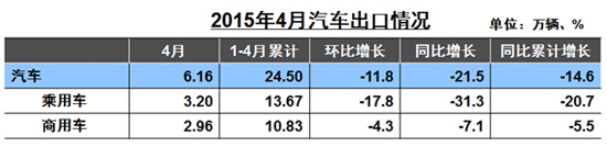4月汽车企业出口为6.16万辆,比上月下降11.8%,本月降幅是今年以来的月度最大降幅。汽车工业协会副秘书长师建华提到,今年汽车出口情况不乐观。短期内影响出口情况的原因,一是由于出口国政治因素,二是人民币汇率升值,三是部分汽车企业调整出口结构。除此之外,我国出口大多是小排量汽车,出口市场接近饱和,品牌竞争力不强,出口国家税务政策等方面,也长期影响到我国汽车出口。