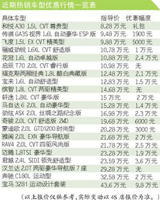 五月下旬,虽然大部分车型的优惠略有回缩,尤其是热销的车型的现金让利方面,普遍收缩2000~3000元。但在市场“普降”情况下,新车“吊高”来卖不一定能讨好消费者,所以更多的新车选择了换种优惠继续让利。如北京现代持续推广“特卖季”活动,全系车型最高优惠4万元,最实惠的悦动五月份购车享受最低5.98万元起的售价,置换购车,旧车可加价2万元回收外,还享受优惠金融补贴;一汽丰田则率先打起了公务员的“主意”:公务员购买皇冠独家补贴6000元之类,此外花冠、卡罗拉等优惠2万元以上;长安福特则借由新福克斯即将上市,清理现款福克斯,推出购买福克斯享“长安福特员工价”的噱头,不仅购置税全免,还可额外优惠8000元;一汽马自达则联合银行举办VIP客户专场,新车享8.8折优惠;而上海大众、上海通用等经销商在“官降”的实在优惠之后,最多只送些礼包,部分经销商则在售后保养上下工夫,如有品牌对出购车送终身保养工时八折优惠、千元保养工时券等。相较而言,广本经销商则有些“有心无力”,飞度目前优惠5000元,但无现车,热销的缤智也没有现车供应,较大优惠的是歌诗图,最高优惠2.8万元,新款奥德赛、凌派则有8000元让利。