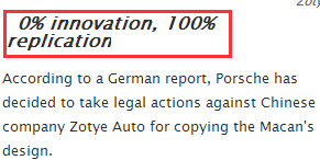 德国媒体用“0创新、100%复制”作为小标题,简述了众泰T700与保时捷Macan的外观特征,称该车外形和保时捷Macan中型SUV极其相似,从进气格栅、车顶曲线等都明显仿照了Macan,仅在前后车灯和排气管等部位有所差异。