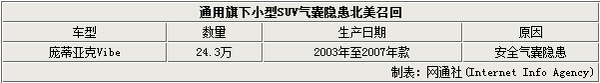 根据美国国家公路安全管理局(NHTSA)公布的消息,本次召回车型为庞蒂亚克Vibe车型,生产日期为2003年至2007年,共涉及约24.3万辆。中国暂不涉及。