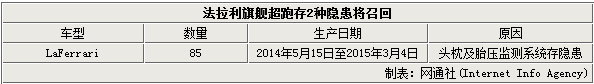 根据美国高速公路安全管理局(NHTSA)公布的消息,此次法拉利汽车公司由于座椅头枕以及胎压监测系统均存在隐患而进行召回,召回范围为2014年5月15日至2015年3月4日期间生产的LaFerrari车型,共涉及约85辆。