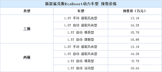 大家肯定很关心价格,不过长安福特这次却又买起了关子,仅公布了1.0T和1.5T两款动力8款车型的预售价格,而关于1.6L车型的消息只字未提,难道是想给我们一个惊喜?那已公布的预售价格又怎样呢?看看下面的图表吧。