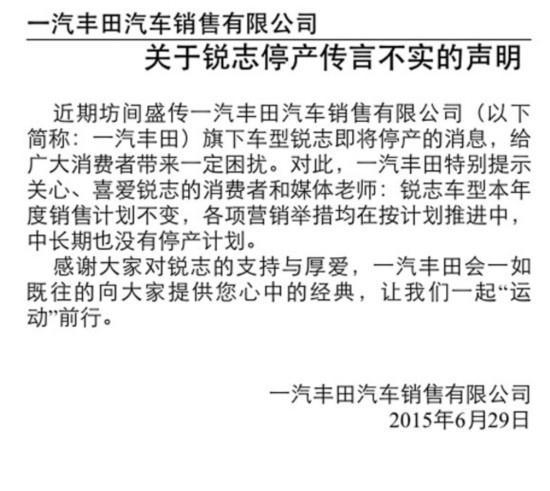 近日,有关一汽丰田锐志即将停产的消息甚嚣尘上,网友之间流传着各种揣测和 猜想,29日,一则丰田辟谣的公告看似打破了这些说法。但是无风不起浪,而且各种有根有据的猜想也正是大家对于丰田目前的各种看法,锐志销量下滑已经是不 争的事实,而旗舰车型皇冠的销量表现比锐志更是有过之而无不及,作为共用生产线的两个车型,大家不免会揣测,锐志停产,下一个会是皇冠吗?