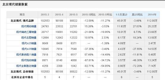 受整体车市放缓的影响,2015年以来,北京现代销售成绩不理想。从数据上看,今年连续几个月整体销量下降明 显,由3月的10万辆,降至6月的6万辆。1-5月的累计销量同比下降了3.48%,6月更是被竞争对手长安福特超越,排名降至第八。除了朗动、瑞纳三厢 和名图有所增长以外,其它车型销量都呈现下滑趋势。其中SUV车型新胜达5月销量仅为1042辆,同比下降竟达82.71%,边缘化趋势明显。