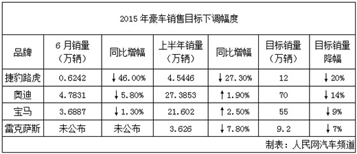 捷豹路虎上半年销量同比下降27.3%,导致捷豹路虎对经销商的零售目标不得不下调15%-20%;奥迪上半年微增1.9%,销量目标从年初的70万辆,调低14%变为65万辆;宝马的情况与奥迪相似,上半年虽然同样小幅度增长,但是销量目标同样调低;雷克萨斯销量目标从9.2万辆降低到8.6万辆,下降7%左右。