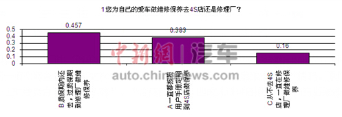 在为爱车做维修保养方面,是去4S店?还是去修理厂?中新网汽车频道方面的调查显示,20%的人群一直都按照用户手册定期到4S店做保养,70%的人群在质保期内去、但过质保期之后会到修理厂做维修保养;数字100市场研究公司调查显示,38.3%的人按照用户手册到4S店做保养,45.7%的人群在质保期内去、但过质保期之后会到修理厂做维修保养。可见,保质期内选择4S店、保质期之外选择修理厂是多数人的选择。