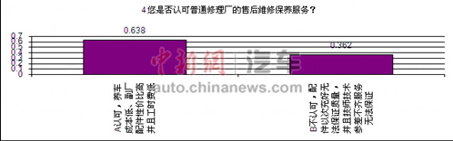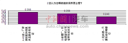 在“您认为去哪做维修保养更合理?”问题上,中新网汽车频道调查显示,36.4% 的人认为,4S店更合理,因为厂家授权配件保真并且服务有保证;45.5%的人认为修理厂更好,价格便宜可以节省养车成本支出;18.2%的人表示“无所谓,只要车修好哪都行”。与此不同的是,数字100市场研究公司调查显示,39.8%的人选择4S店;35.6%的人选择修理厂,其他人表示“无所谓”。