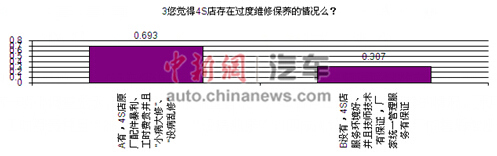 在“您觉得4S店存在过度维修保养的情况么?”问题上,超过90%的被调查者认为, 4S店原厂配件暴利、工时费贵并且“小病大修”、“没病乱修”;其余的人认为,4S店服务环境好、并且技师技术有保证 ,厂家统一管理服务有保证。数字100市场研究公司调查显示,69.3%的人认为,存在过度维修保养的情况,其余的人认为没有这种情况。