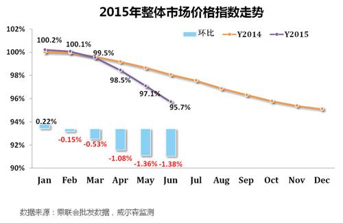 2015年上半年整体市场价格指数累计降幅4.5%,与2014年全年指数累计降幅4.9%相比仅差0.4个百分点。尤其是二季度以来,4至6月份连续3个月的指数降幅均超过1%,且降幅呈逐月增加态势。