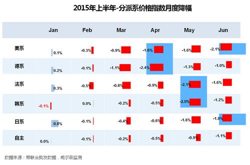 5月份,韩系、法系率先加入降价大潮,北京现代以2.8%的环比跌幅位居榜首,终端优惠增加2200元;法系东风标致和雪铁龙的降幅均在2%左右,加权折扣增加约2000元;随后,上海通用宣布“官降”,当期指数跌幅为1.9%,加权成交价下降1200元。到了6月份,日系部分厂商迫于半年销售目标的压力而大举让利,其中一汽丰田和东风日产当期指数分别下降2.7%和2.4%,当期折扣环比增加近3000元;美系依旧跌跌不休,而上汽通用和长安福特指数降幅均在2%左右,其中长安福特当期优惠增加2250元。