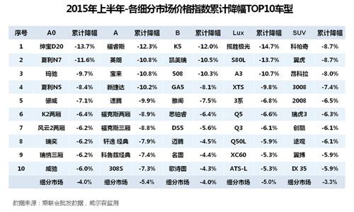 受经济形势影响,2015年上半年豪华车市场遇冷,多个车型的销量遭遇滑坡。其中,揽胜极光国产销量下滑,终端大幅让利,价格指数累计下滑14.7%领跌,6月终端折扣接近8万元;5月凯迪拉克官降,各车型指导价下降1-3万元不等,旗下的XTS和ATS-L两款车型入围价格指数累计跌幅TOP10;而奥迪Q3、Q5逐渐进入生命周期末期,在严峻的市场形势中降价冲量,国产奥迪A3自去年上市以来,价格指数连续下跌,较年初折扣增加22000元,目前的折扣率水平超过16%,已超过一汽奥迪旗下的其他车款。