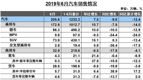 上半年,汽车产销分别完成1213.2万辆和1232.3万辆,同比分别下降13.7%和12.4%。陈士华表示,今年上半年汽车产销出现大幅下滑主要是受到宏观经济下行的影响。此外,国五、国六的切换过程中,消费者处于观望状态,也不利于汽车产业的发展。